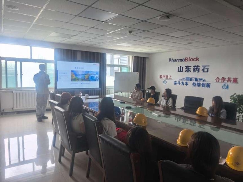 抵达山东药石药业有限公司后,在公司二楼会议室召开了欢迎会,公司副总致欢迎辞,希望同学们通过这次实习,对医药中间体合成、山东药石药业有一个更加全面、更加深入的认识,也随时欢迎各位同学来山东药石就业、创业。随后,公司人力资源部刘经理、新葡萄8883官网AMG2015届校友,研发部主任陈程,新葡萄8883官网AMG2014届校友,安全主管谷雨围绕公司情况、项目建设、产品工艺流程、安全注意事项、发展规划等五个方面向大学生们做详细讲解。